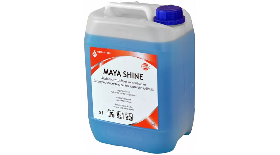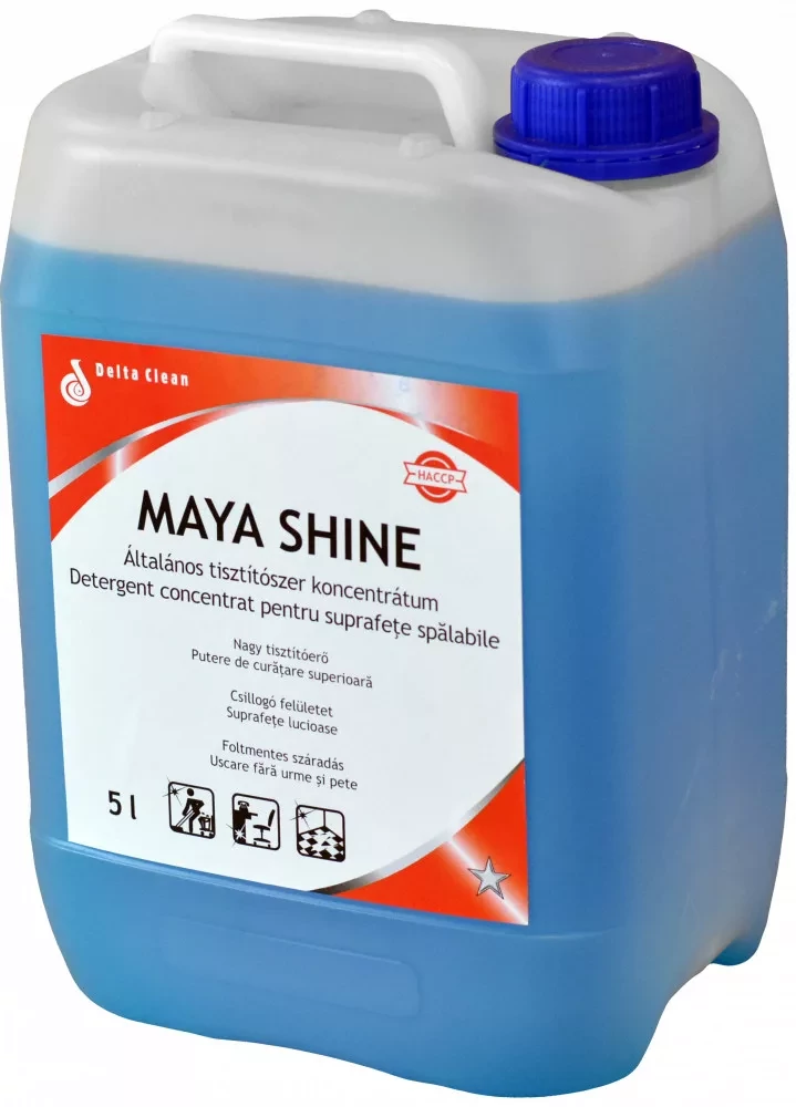 A Maya Shine általános tisztítószer koncentrátum alkalmas minden mosható felület napi tisztítására. A felület fényét megőrizve, foltmentesen szárad, így utántörlés nem szükséges. Nagy tisztítóerő, használat utáni csillogó felület és kellemes illat jellemzi. A tisztítószer minden mosható felület takarítására alkalmas, különös tekintettel a parketta, kőpadló, járólap, üveg– és műanyag felületekre. Adagolás: 0,25-1%-os koncentrációban: 25-100 ml Maya Shine 10 l felmosóvízbe. (szennyezettebb felület esetén 5-10 %-os koncentrációban 50-100 ml/ l oldat). Összetevők: nemionos felületaktív anyag < 5%, anionos felületaktív anyag <5% oldószer<5%, illat, Methylchloroisothiazolinone, Methyl isothiazol inone, Limonene, Buthyl phenyl Methylpropional, színezék |