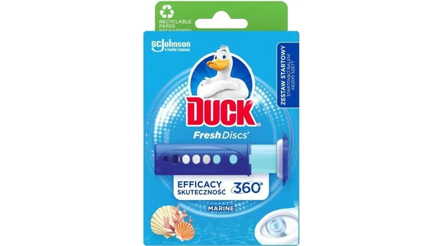 | A Duck® Fresh Discs™ formula öblítésre aktiválódó védőréteget képez a WC-csésze felületén, mely segít megelőzni a vízkőlerakódást. Marine illatának frissességével folyamatosan friss illatot biztosít, minden öblítésnél tisztít. Hosszan tartó hatása akár 720 öblítésen át elegendő. | |